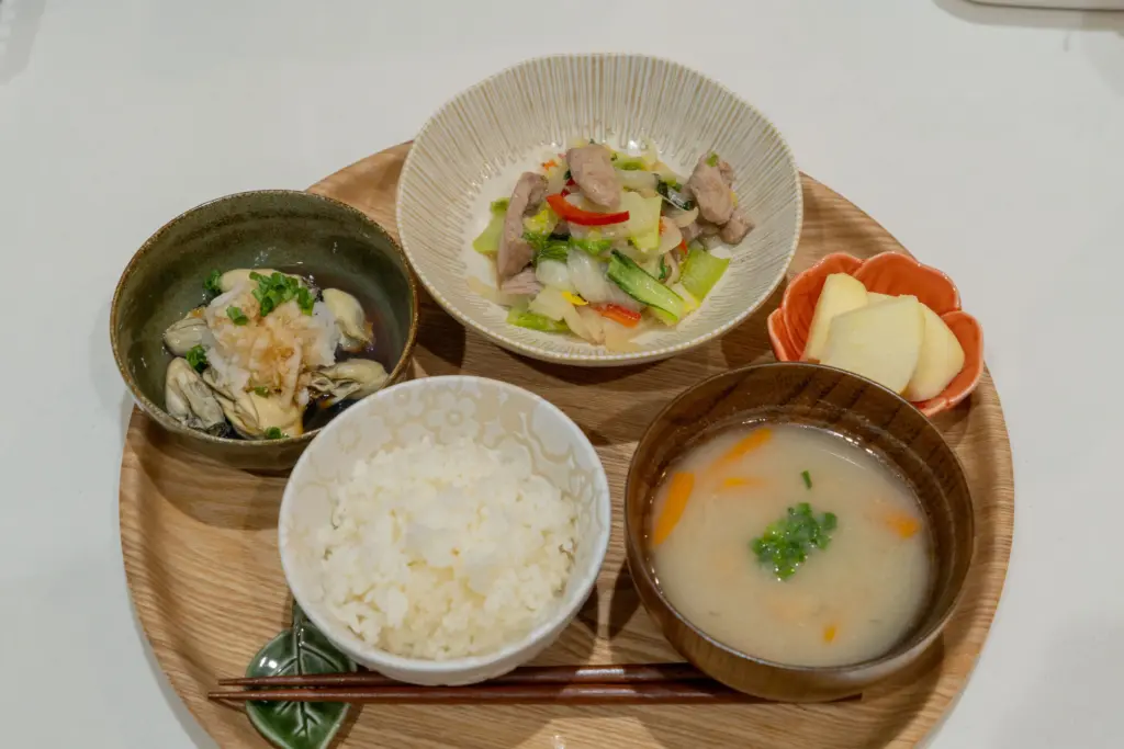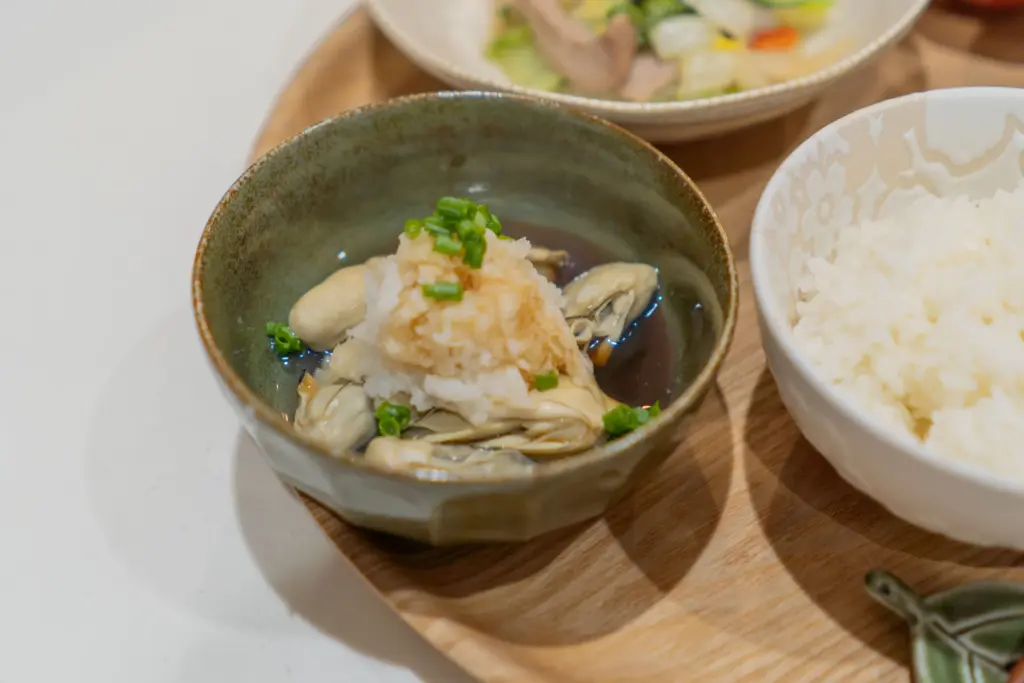 主菜がお肉なので、副菜は魚介に。お湯で火を通した牡蠣に大根おろしとネギ、ポン酢をかけて。シンプルな手順で、他の食材でもアレンジしやすい!