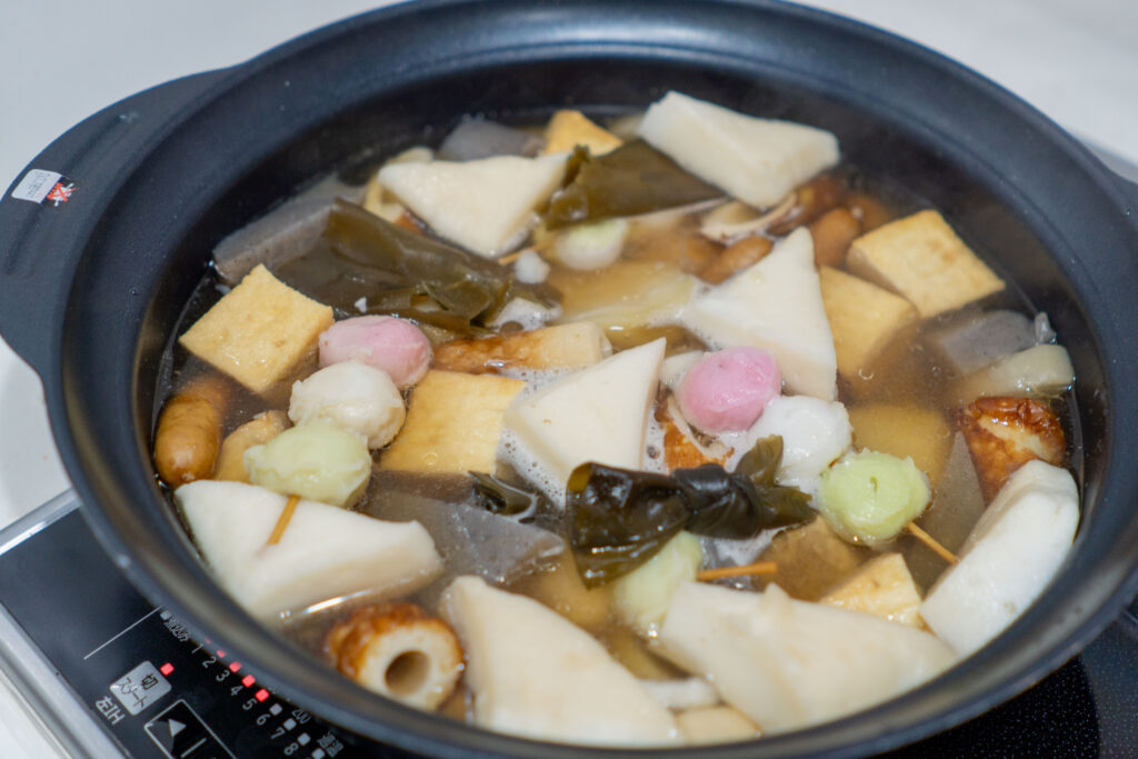【食材】大根、じゃが芋、鶏肉、ウインナー、こんにゃく、ちくわ、はんぺん、厚揚げ、昆布、うどんなど