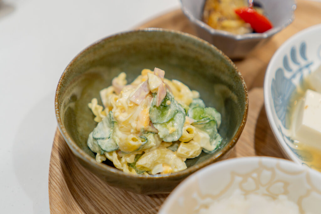 【食材】マカロニ、きゅうり、ゆで卵、ハム、玉ねぎ